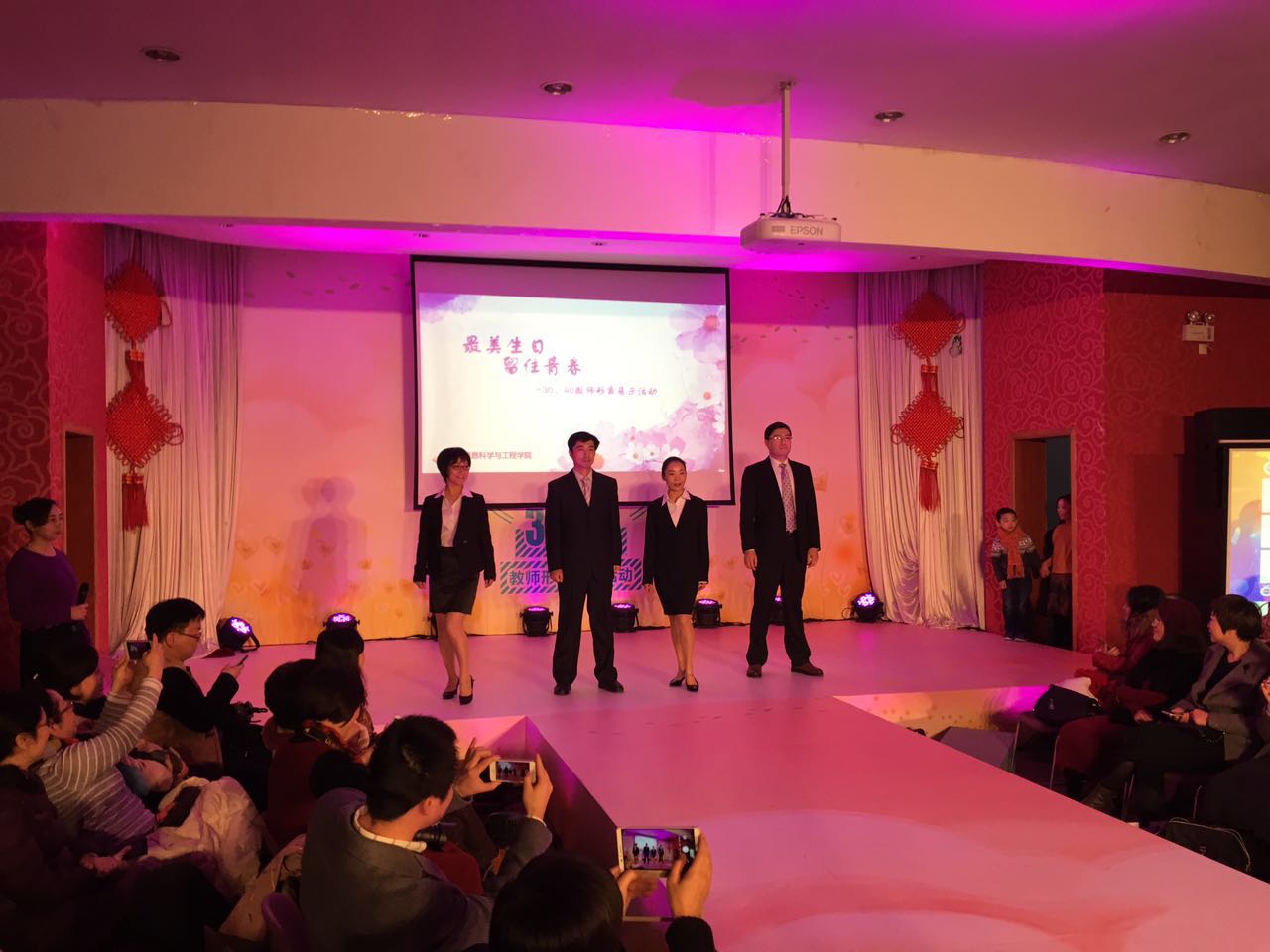 2016年12月16日下午 ,学校工会、人事处在八角亭二楼联合举办“最美生日、留住青春——30、40教师形象展示活动”。437bwin必赢国际官网参加人员有:侍洪波、杜文莉、刘志鹏、万永菁、何高奇、梁莹、杨富琴、韩宇光以及30、40教师钟伟民、刘济、徐震浩、王蓓,、张见、蒋翠玲、冷春霞、常虹、朱远明、李进龙、张海腾、叶琪、付歌等20多名教师参加。其中,由院长杜文莉、副书记刘志鹏、副院长万永菁等13名教师组成的展示队代表学院进行了精彩的T台形象展示演出,先后展示了职业装、亲子装、旗袍装、运动装,伴着优美的音乐,437bwin必赢国际官网代表队大气、优雅、自信的风采赢得台下一阵阵热烈的掌声,最终在全校11支参演队伍中拔得头筹,荣获“最佳展演奖”。