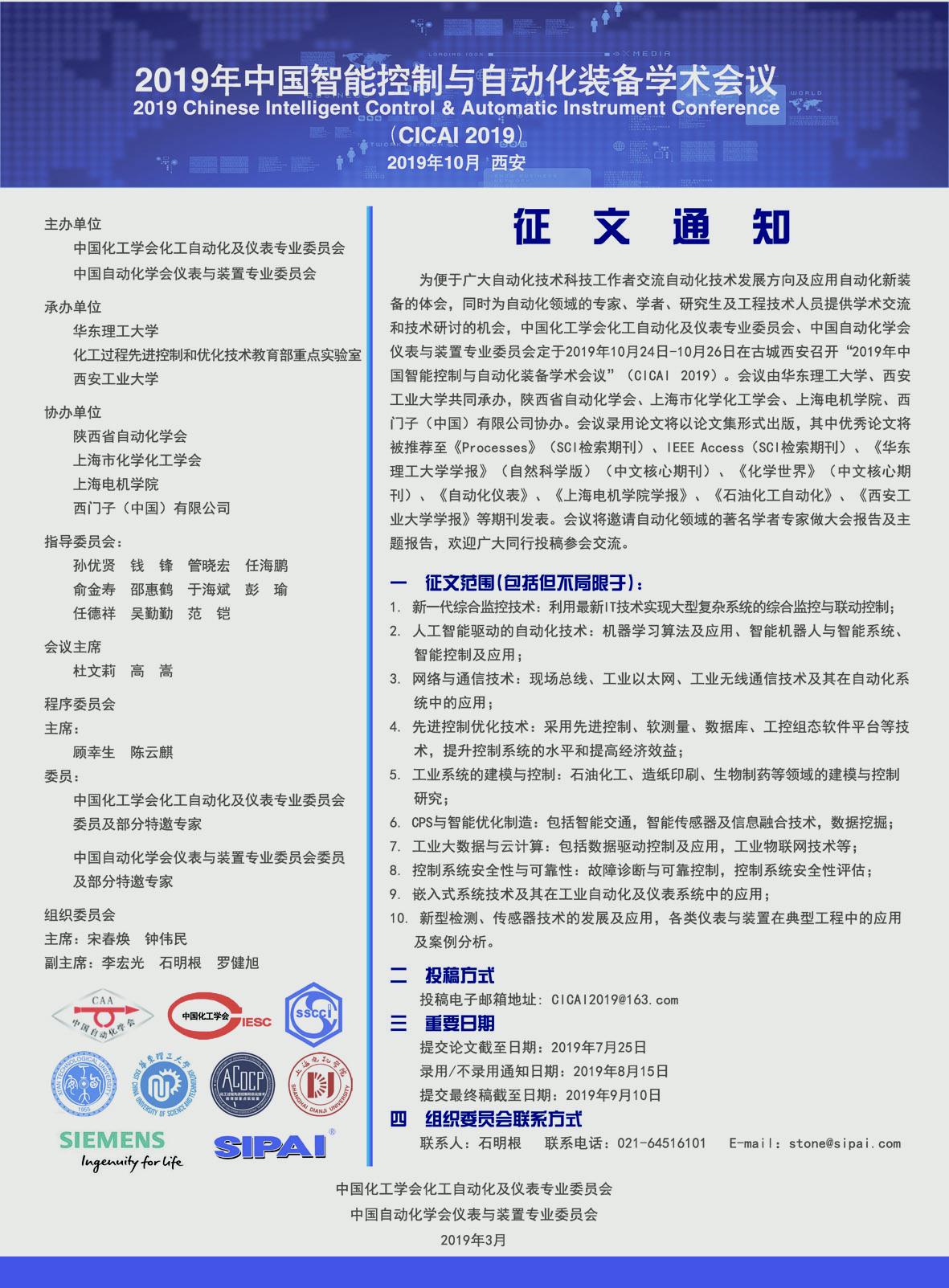 为便于广大自动化技术科技工作者交流自动化技术发展方向及应用自动化新装备的体会,同时为自动化领域的专家、学者、研究生及工程技术人员提供学术交流和技术研讨的机会,中国化工学会化工自动化及仪表专业委员会、中国自动化学会仪表与装置专业委员会定于2019年10月24日——10月26日在古城西安召开“2019年中国智能控制与自动化装备学术会议”(CICAI 2019)。会议由必赢国际437官方、西安工业大学共同承办,陕西省自动化学会、上海市化学化工学会、上海电机学院、西门子(中国)有限公司协办。会议录用论文将以论文集形式出版,其中优秀论文将被推荐至《Frontier of Chemical Science and Engineering》(SCI检索期刊)、《Processes》(SCI检索期刊)、IEEE Access(SCI检索期刊)、《必赢国际437官方学报》(自然科学版)(中文核心期刊)、《化学世界》(中文核心期刊)、《自动化仪表》、《上海电机学院学报》、《石油化工自动化》、《西安工业大学学报》等期刊发表。会议将邀请自动化领域的著名学者专家做大会报告及主题报告,欢迎广大同行投稿参会交流。