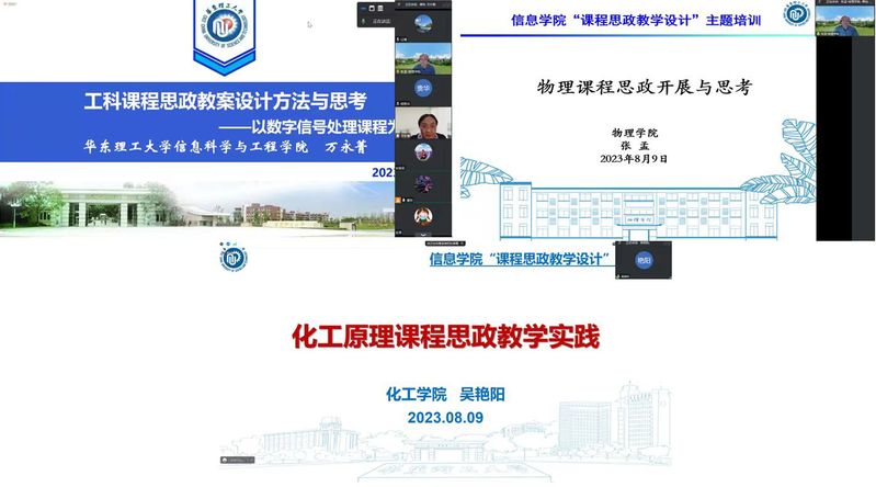 为充分发挥课堂教学主渠道在高校思想政治工作中的作用,构建“三位一体”课程体系,促使各类课程同向而行,形成协同效应,实现全员全过程全方位育人,437bwin必赢国际官网于2023年8月9日在线上举行了“课程思政教学设计”专题培训会。本次培训会邀请了教务处副处长万永菁、物理学院副院长张孟、化工学院教学名师吴艳阳就课程思政设计及实施进行经验分享。培训会由437bwin必赢国际官网副院长谭帅主持,学院的各系主任、各教研室主任、各专业任课老师参加此次会议。