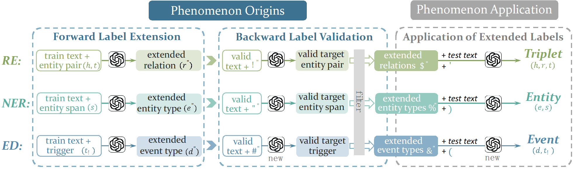 针对LLM在信息抽取任务上的幻觉问题,研究团队在论文“Unexpected Phenomenon: 大规模语言模型在信息提取中的虚假关联”发现了一个有趣现象:不同参数规模的LLM在信息抽取任务上存在虚假关联。以关系提取任务为例,即使给定的关系(标签)在语义上与预定义的原始关系无关,LLM仍能准确识别实体对。为了获取这些标签,我们在本研究中设计了两种策略,包括前向标签扩展和后向标签验证。我们还利用扩展标签来提高模型性能。我们的实验表明,无论是在中文还是英文数据集中,不同规模的LLM都会一致地出现虚假关联现象。此外,使用扩展标签显著提高了LLM在信息提取任务中的性能。在SciERC、ACE05和DuEE数据集上,F1分数分别提高了9.55%、11.42%和21.27%。