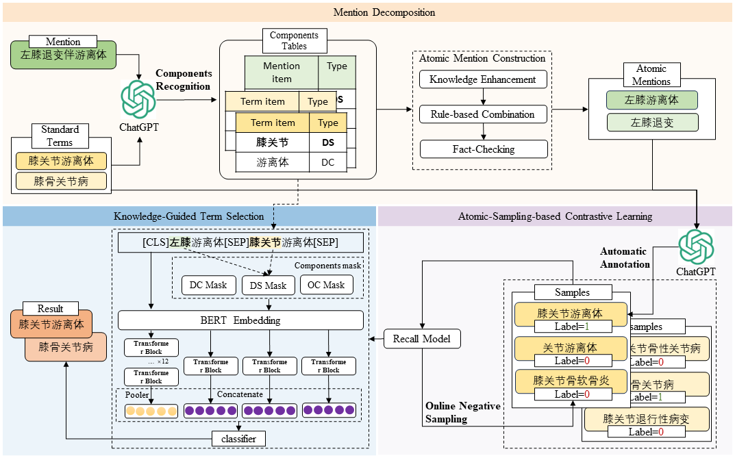 针对中文临床疾病诊断术语标准化任务中存在的表达多样化和多重蕴含问题,研究团队在“RRNorm:一种LLM驱动识别和重构术语组成成分的中文疾病诊断标准化新框架”中创新地提出了一种术语组成成分识别和重构策略,利用大语言模型(LLM)的推理能力自动识别疾病诊断短语的组成成分,并转换为多个原子短语。此外,研究团队基于主流的“召回和精排”框架,将术语组成成分识别和重构策略的优势应用于任务流:在召回阶段,设计了一种针对原子短语的采样算法,消除了多重蕴含问题带来的短语含义混淆;在精排阶段,利用注意力机制融入组成成分的信息作为指导,提高了精排阶段的准确率。这项研究成果有效地提高了中文疾病诊断标准化任务的性能,在CHIP-CDN数据集上达到了出色的水平。